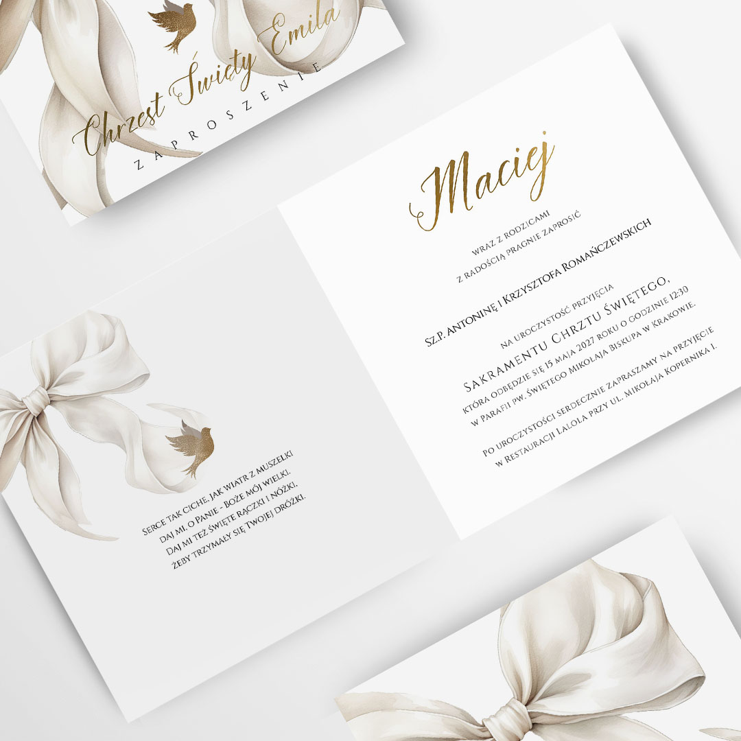 Każde zaproszenie wykonane jest z wysokiej jakości materiałów, co zapewnia estetyczny wygląd i trwałość. Proponujemy delikatne, uniwersalne wzory graficzne, które doskonale wpisują się w uroczysty charakter wydarzenia. Subtelna kolorystyka, staranne wykończenie i składana forma sprawiają, że zaproszenia prezentują się pięknie zarówno w dłoniach gości, jak i na stole podczas przyjęcia.
