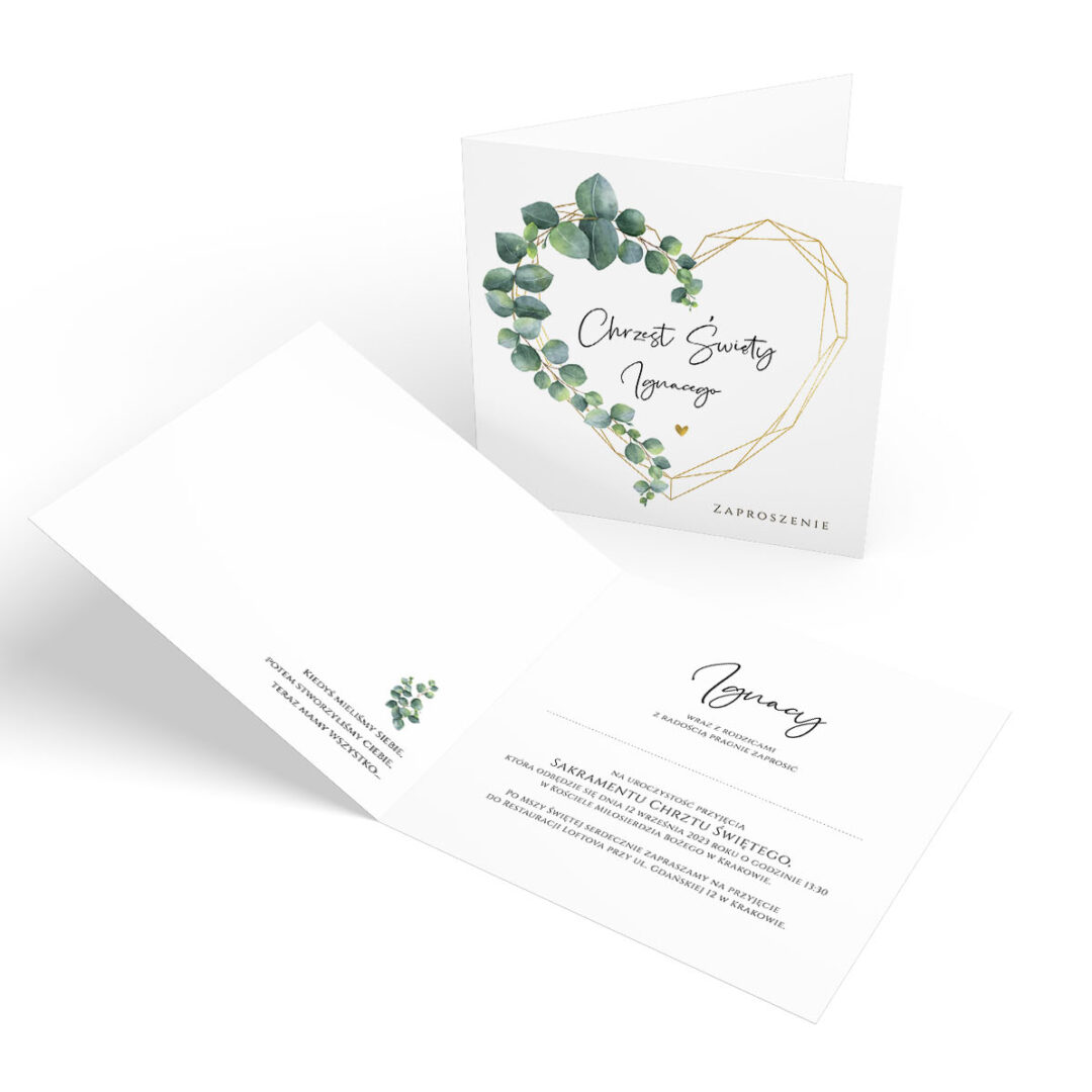 Zaproszenie na Chrzest Święty z serduszkiem oraz eukaliptusem- AW°3071