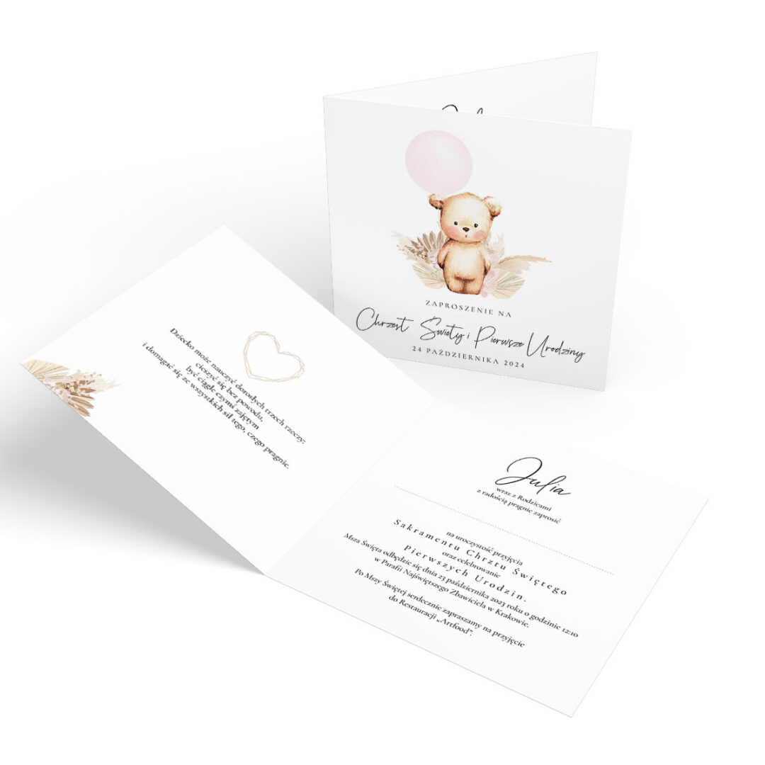 Zaproszenie na Chrzest Święty z różowym balonikiem dla dziewczynki – N°1263