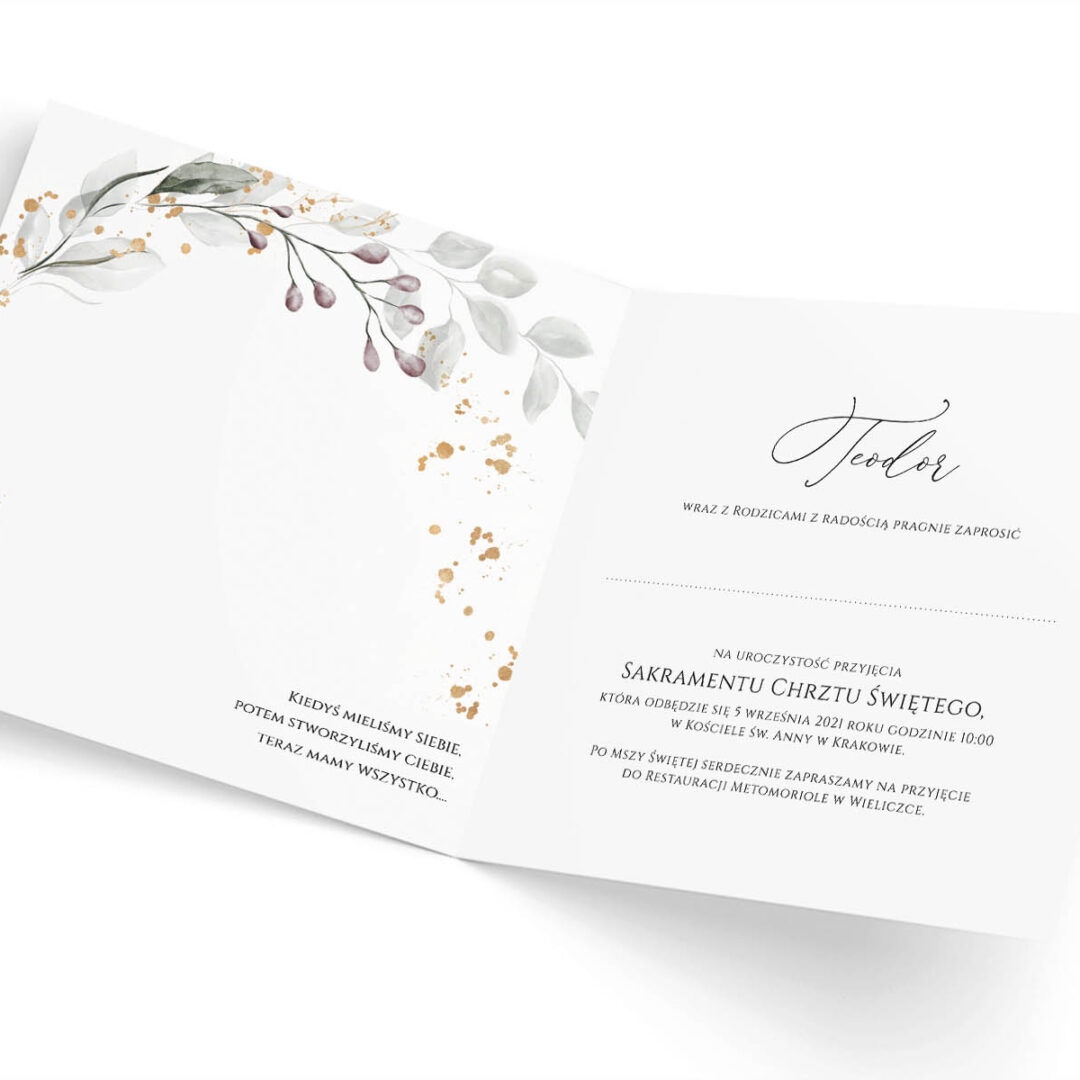 Zaproszenie na Chrzest Święty ze zdjęciem z gałązkami eukaliptusa – Harry