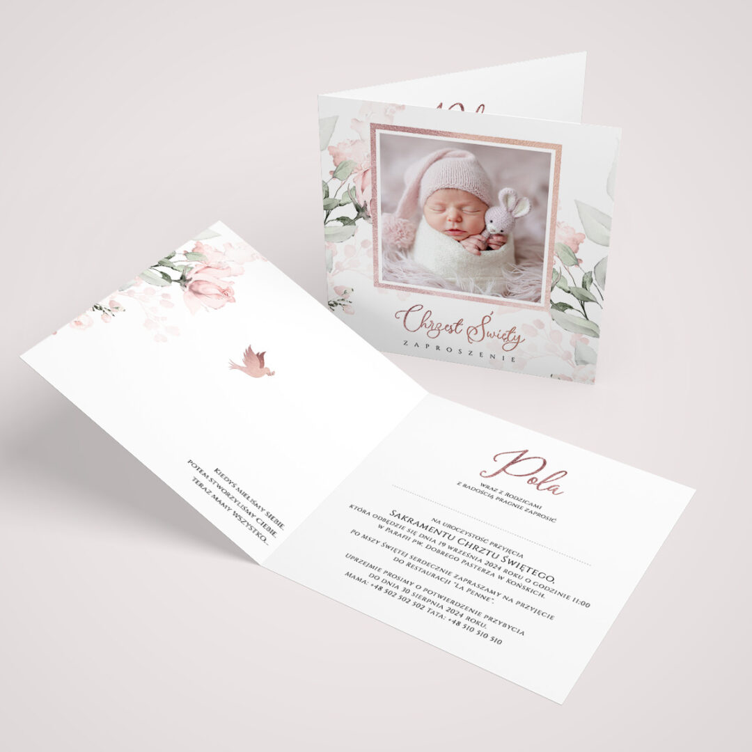 Personalizowane zaproszenie na chrzest ze zdjęciem i motywem kwiatowym