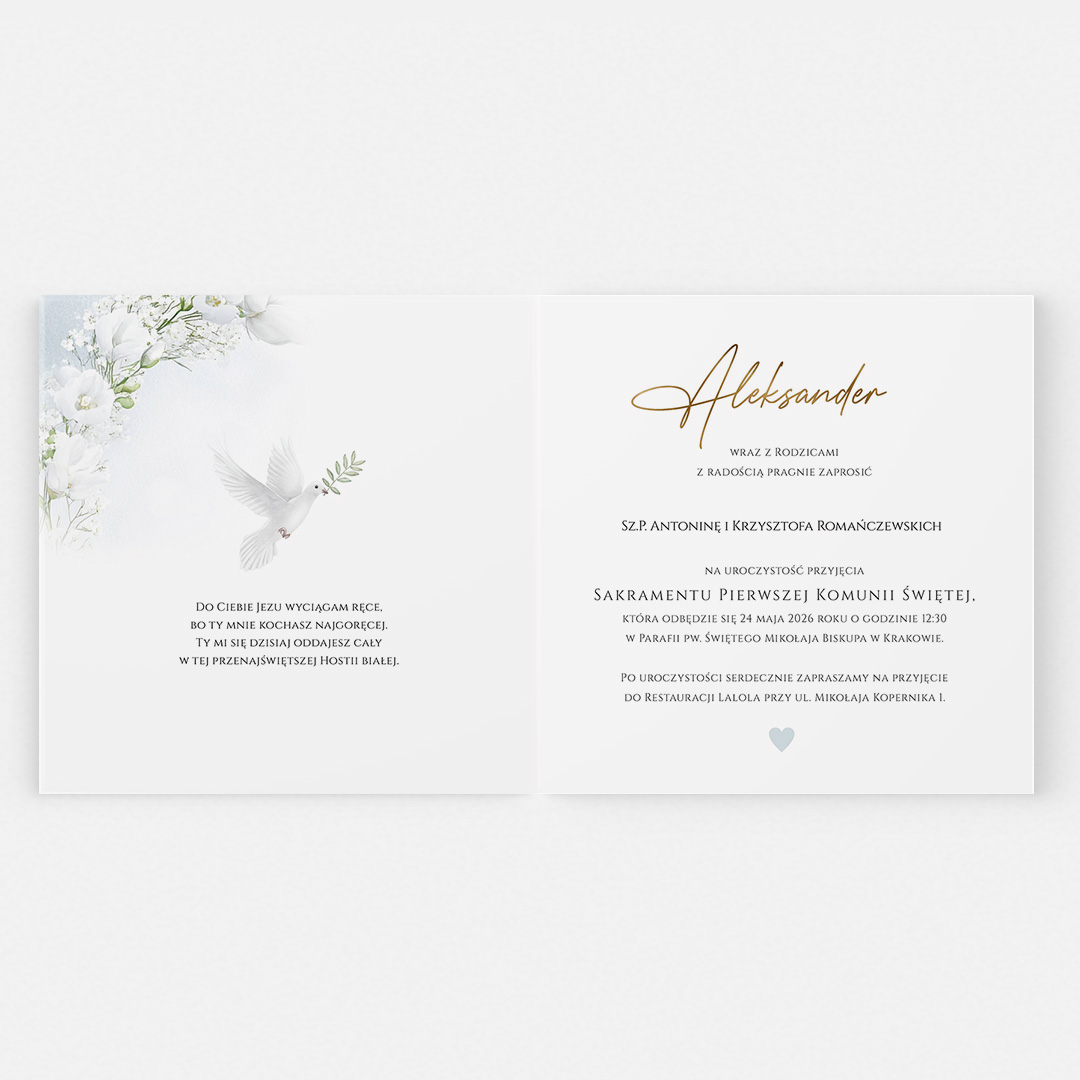 Nasze zaproszenia to coś więcej niż produkt – to piękny sposób na podkreślenie ważności Pierwszej Komunii Świętej i zaproszenie bliskich w elegancki sposób.