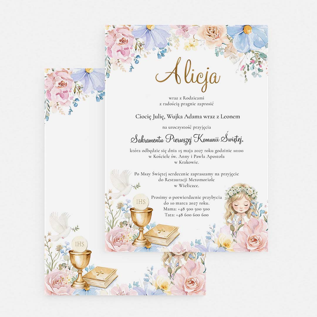 Nasze zaproszenia komunijne to coś więcej niż praktyczna informacja o wydarzeniu. To także piękny wyraz wdzięczności i szacunku wobec zaproszonych gości. Dzięki personalizacji możesz dostosować każdy szczegół zaproszenia: