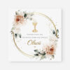 Zaproszenie na Pierwszą Komunię Świętą dla chłopca to elegancka, jednokartkowa forma zaproszenia utrzymana w jasnej, subtelnej kolorystyce.