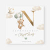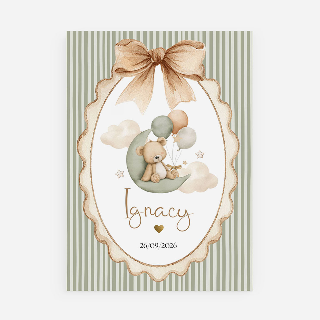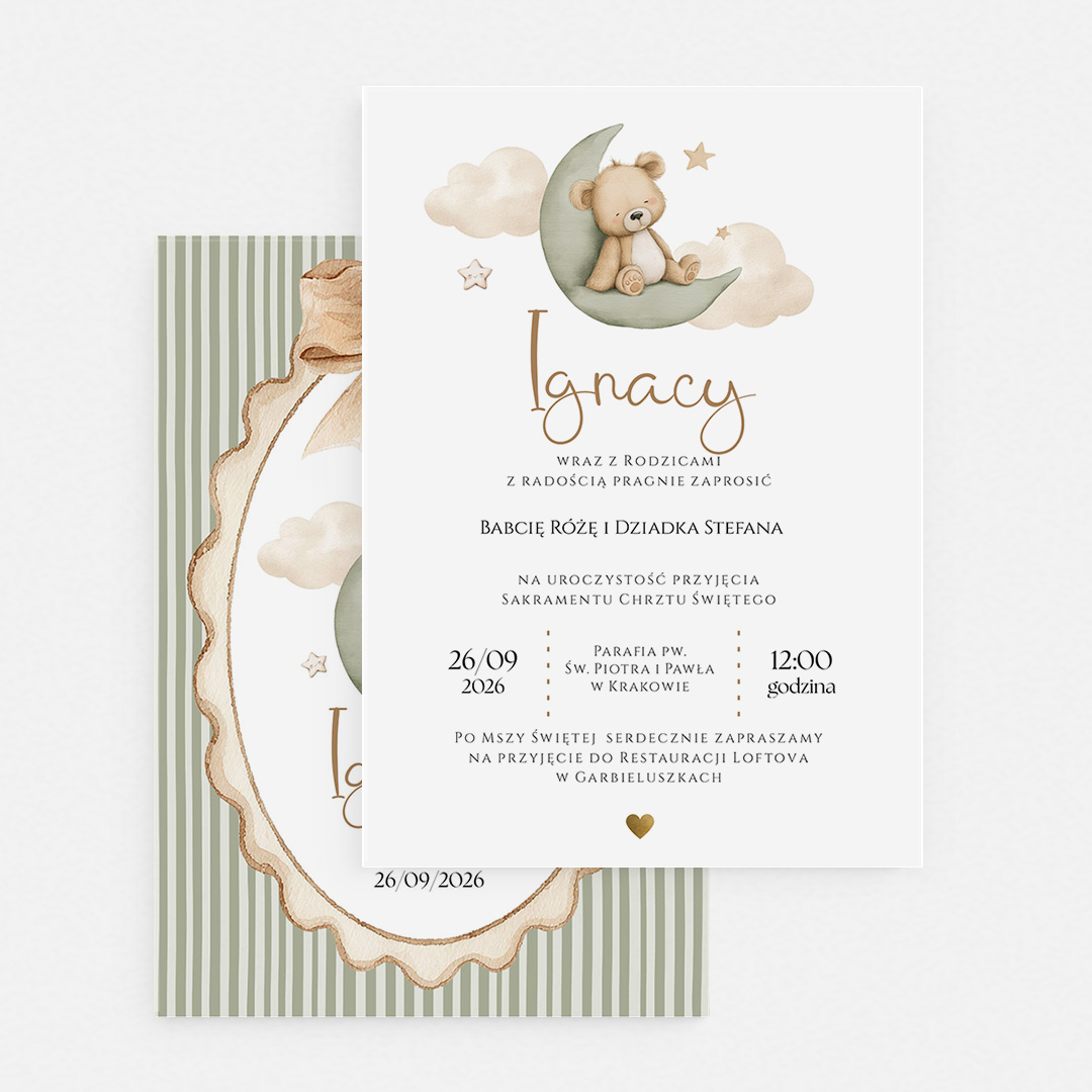 Jednokartkowe zaproszenie na chrzest dla chłopca z uroczym motywem misia siedzącego na księżycu to wyjątkowa propozycja na tę ważną uroczystość. Delikatna, pastelowa kolorystyka oraz ilustracja w stylu dziecięcej akwareli tworzą ciepły, subtelny i elegancki efekt. Zaproszenie oferuje możliwość pełnej personalizacji treści, imienia dziecka oraz szczegółów ceremonii, zachowując estetyczny i spójny wygląd.