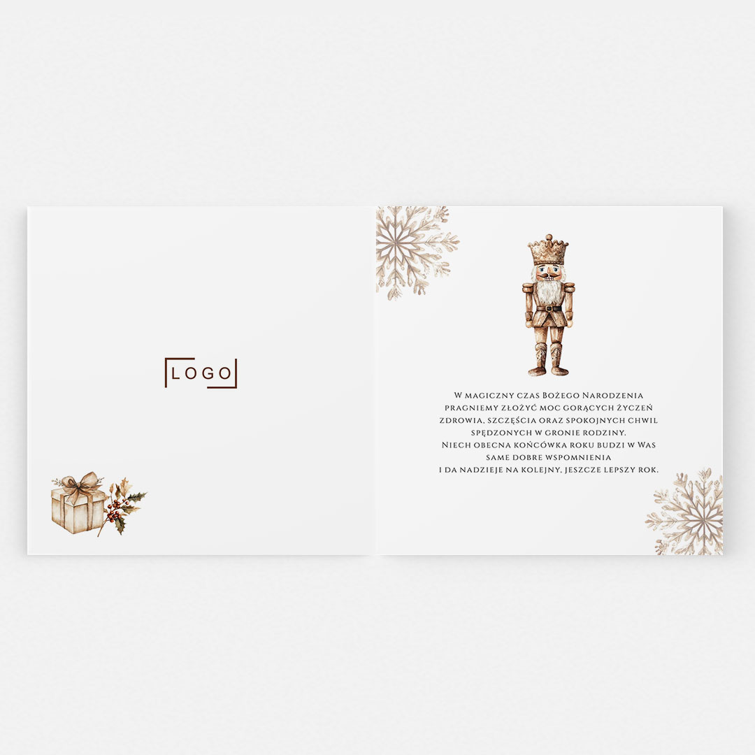 Logowane kartki świąteczne po złożeniu mają wymiary 14,5×14,5 cm – co oznacza, że wymiarem jest idealnie dopasowana do koperty. Ten uniwersalny format sprawia, że nasza kartka doskonale sprawdzi się zarówno w prywatnych życzeniach dla bliskich, jak i w eleganckich podziękowaniach dla partnerów biznesowych. Połącz wyjątkowy wygląd z praktycznością, wybierając format, który zawsze pasuje!