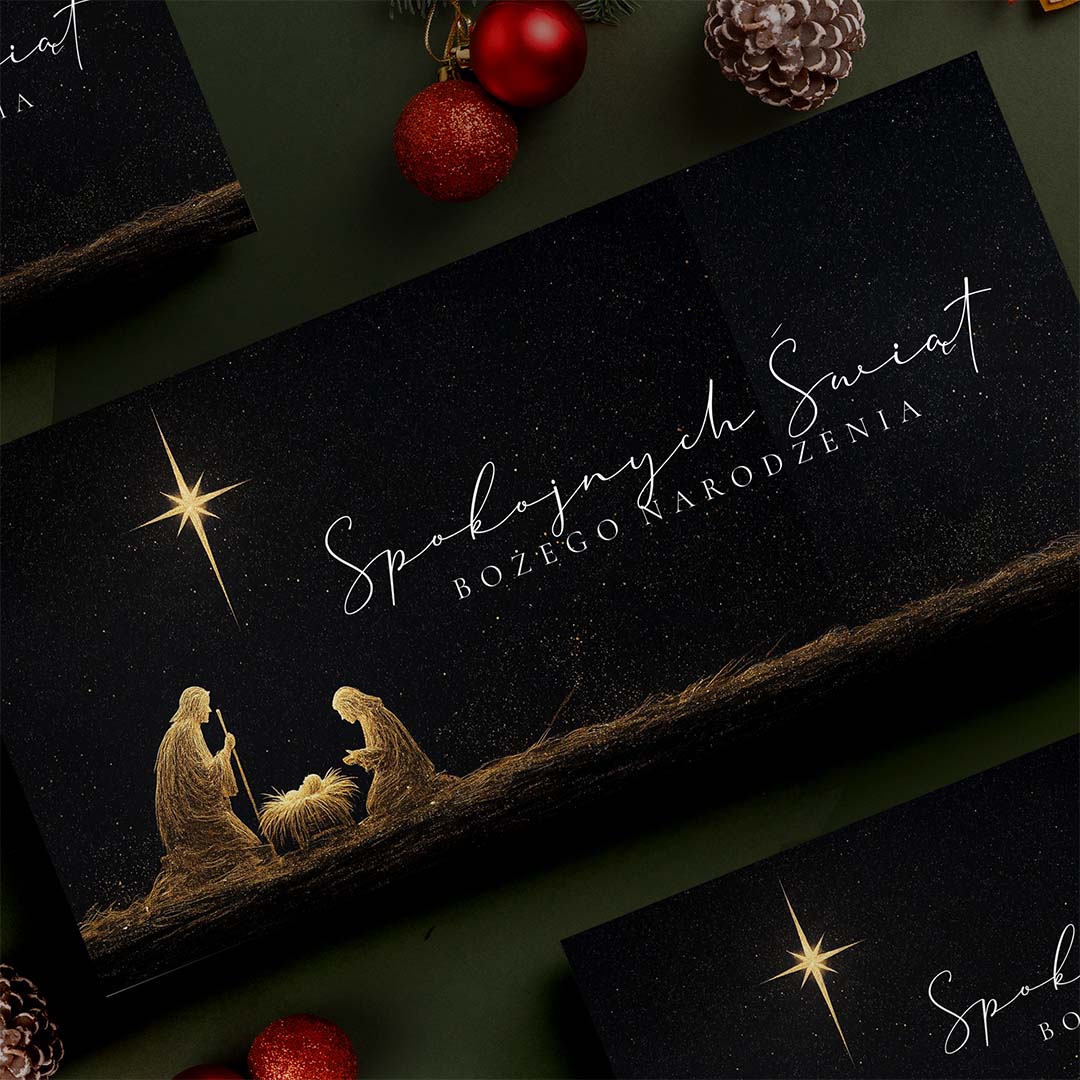 Nasze kartki świąteczne drukowane są na wysokiej jakości białym papierze o satynowym wykończeniu i gramaturze 350g, co nadaje im wyjątkowo elegancki wygląd. Taki papier jest rzadko spotykany w tego typu produktach, dzięki czemu nasze kartki wyróżniają się na tle innych. Jego solidność sprawia, że kartki są trwałe i idealne do przechowywania jako pamiątka na długie lata, a wyrazistość nadruku dodatkowo podkreśla ich luksusowy charakter.