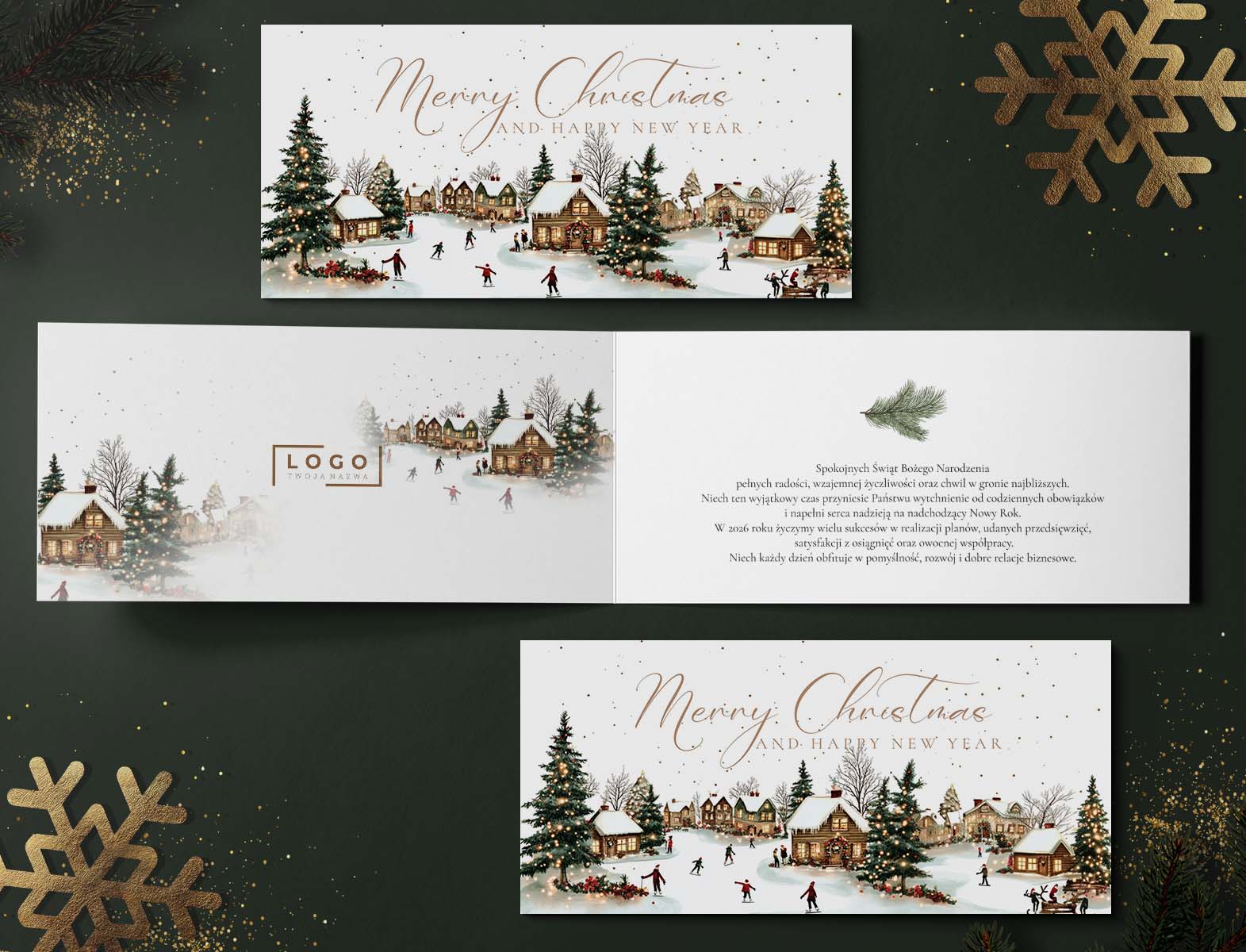 Logowane kartki świąteczne po złożeniu mają wymiary 14,5×14,5 cm – co oznacza, że wymiarem jest idealnie dopasowana do koperty. Ten uniwersalny format sprawia, że nasza kartka doskonale sprawdzi się zarówno w prywatnych życzeniach dla bliskich, jak i w eleganckich podziękowaniach dla partnerów biznesowych. Połącz wyjątkowy wygląd z praktycznością, wybierając format, który zawsze pasuje!
