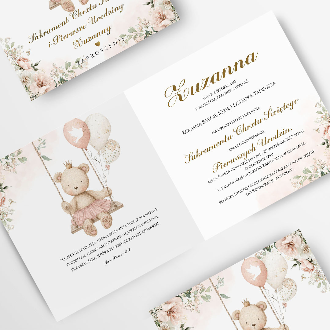 Zaproszenia na chrzest i roczek to elegancki sposób na przekazanie bliskim najważniejszych informacji o nadchodzącej uroczystości. Nasze zaproszenia zostały stworzone z myślą o wyjątkowych chwilach – łączą klasykę z nowoczesnym designem i oferują pełną personalizację treści.