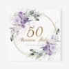 Pełne klasy zaproszenie na Złote Gody, zdobione kompozycją głębokich fioletowych kwiatów i złotym nadrukiem.