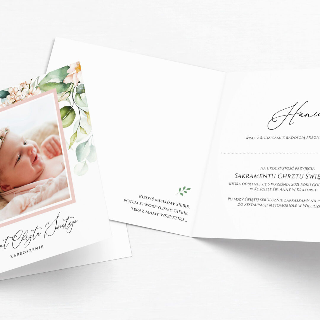 Eleganckie i wyjątkowe zaproszenie na Chrzest Święty ze zdjęciem Twojego maluszka wyróżnia się delikatnym designem i możliwością personalizacji. Wykonane z najwyższej jakości satynowanego papieru, zaproszenie z pewnością zrobi wrażenie na Twoich gościach. Centralnym elementem jest zdjęcie dziecka otoczone subtelnymi, kwiatowymi motywami w pastelowych odcieniach, które dodają całości uroku i elegancji.