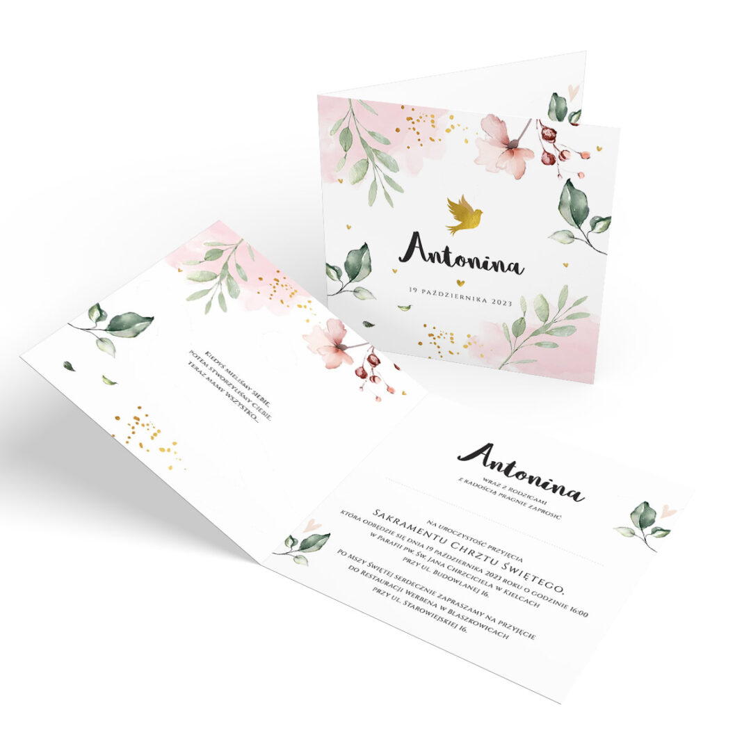 - Motyw kwiatowy: Delikatne, pastelowe kwiaty nadają zaproszeniu elegancki i ponadczasowy charakter.