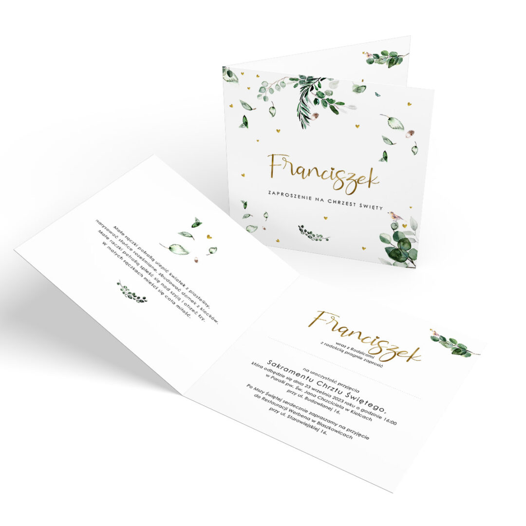 - Format: Kwadratowe zaproszenie o wymiarach 14,5 x 14,5 cm, idealne do przesyłania pocztą lub wręczania osobiście.