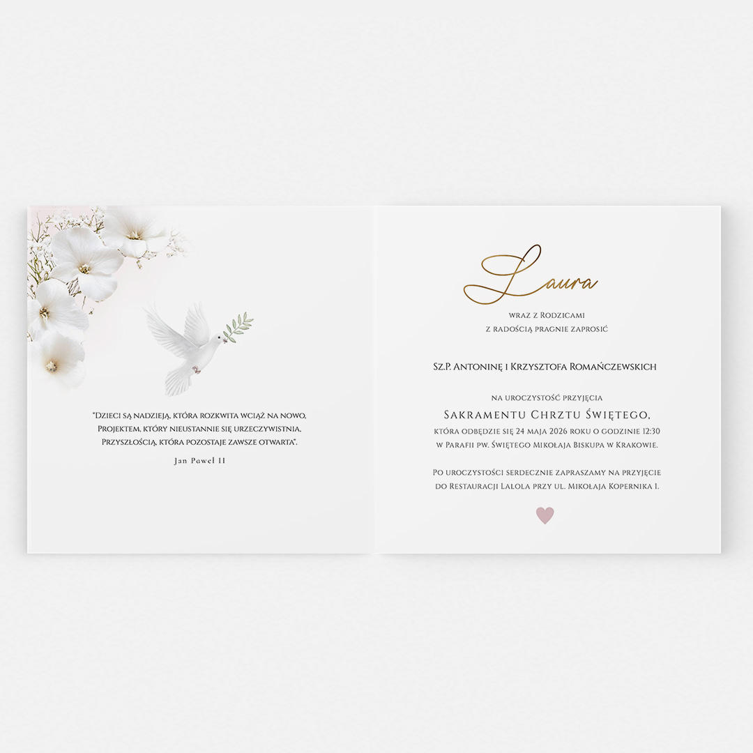 Zaproszenia na chrzest to elegancki sposób na przekazanie bliskim najważniejszych informacji o nadchodzącej uroczystości. Nasze zaproszenia zostały stworzone z myślą o wyjątkowych chwilach – łączą klasykę z nowoczesnym designem i oferują pełną personalizację treści.