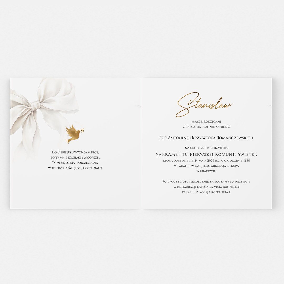 Nasze zaproszenia to coś więcej niż produkt – to piękny sposób na podkreślenie ważności Pierwszej Komunii Świętej i zaproszenie bliskich w elegancki sposób.