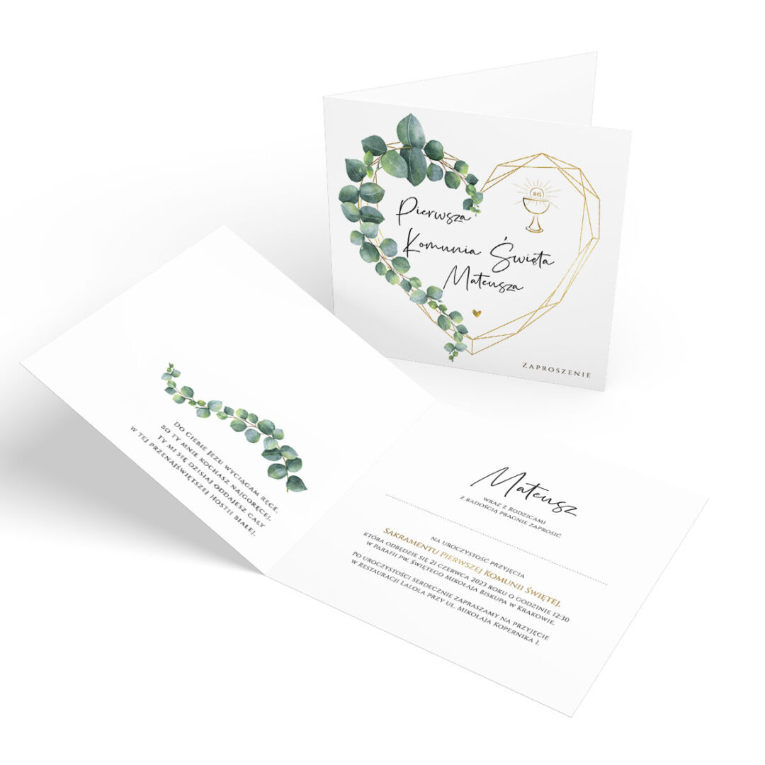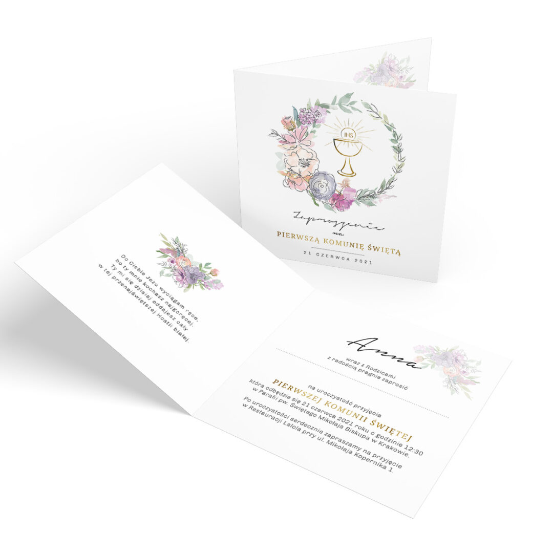 Składane, kwadratowe zaproszenie na Pierwszą Komunię Świętą w odcieniach niebieskiego