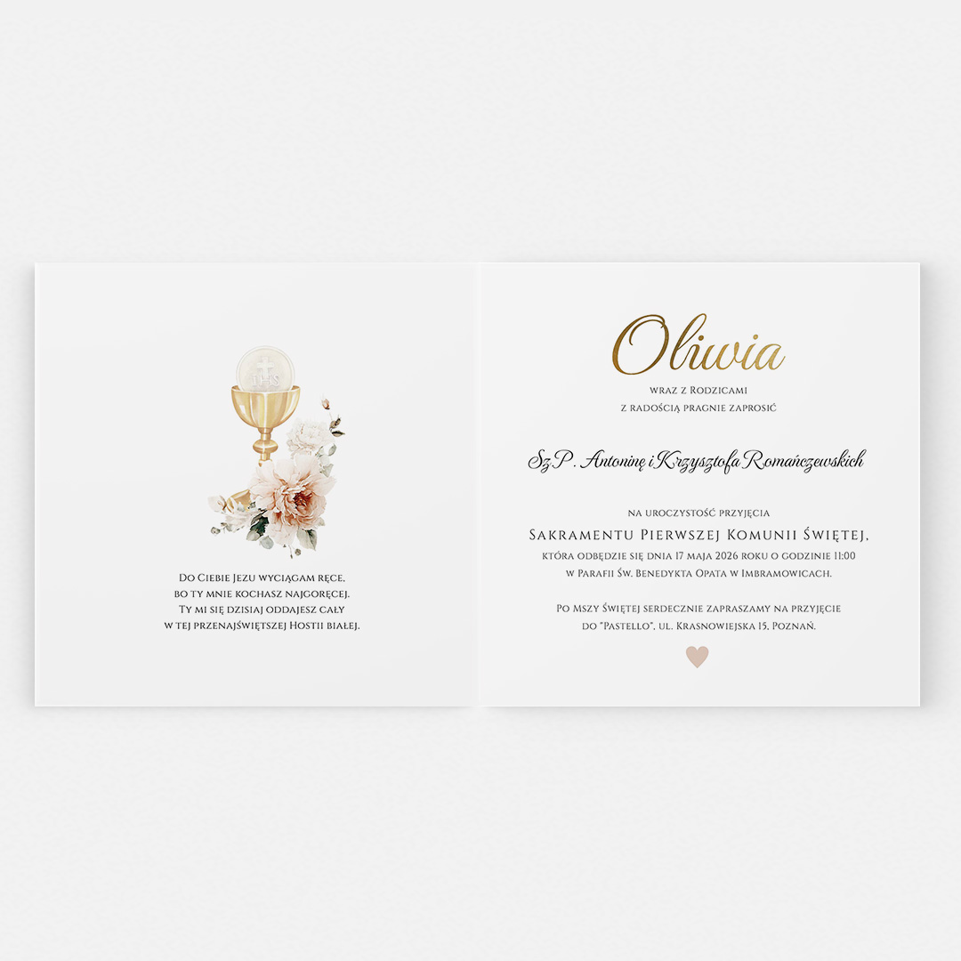 Nasze zaproszenia komunijne to coś więcej niż praktyczna informacja o wydarzeniu. To także piękny wyraz wdzięczności i szacunku wobec zaproszonych gości. Dzięki personalizacji możesz dostosować każdy szczegół zaproszenia: