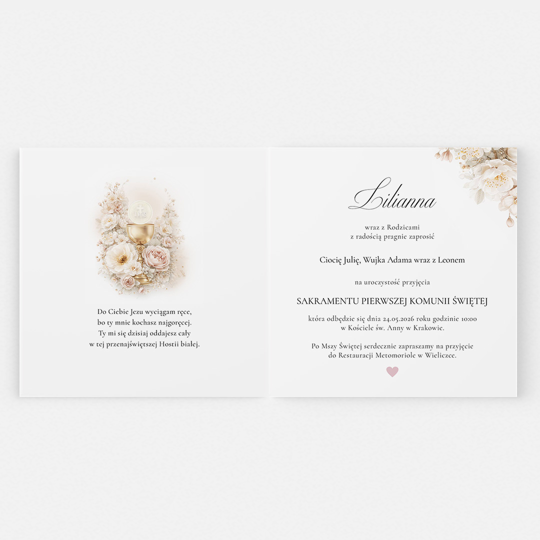 Nasze zaproszenia to coś więcej niż produkt – to piękny sposób na podkreślenie ważności Pierwszej Komunii Świętej i zaproszenie bliskich w elegancki sposób.