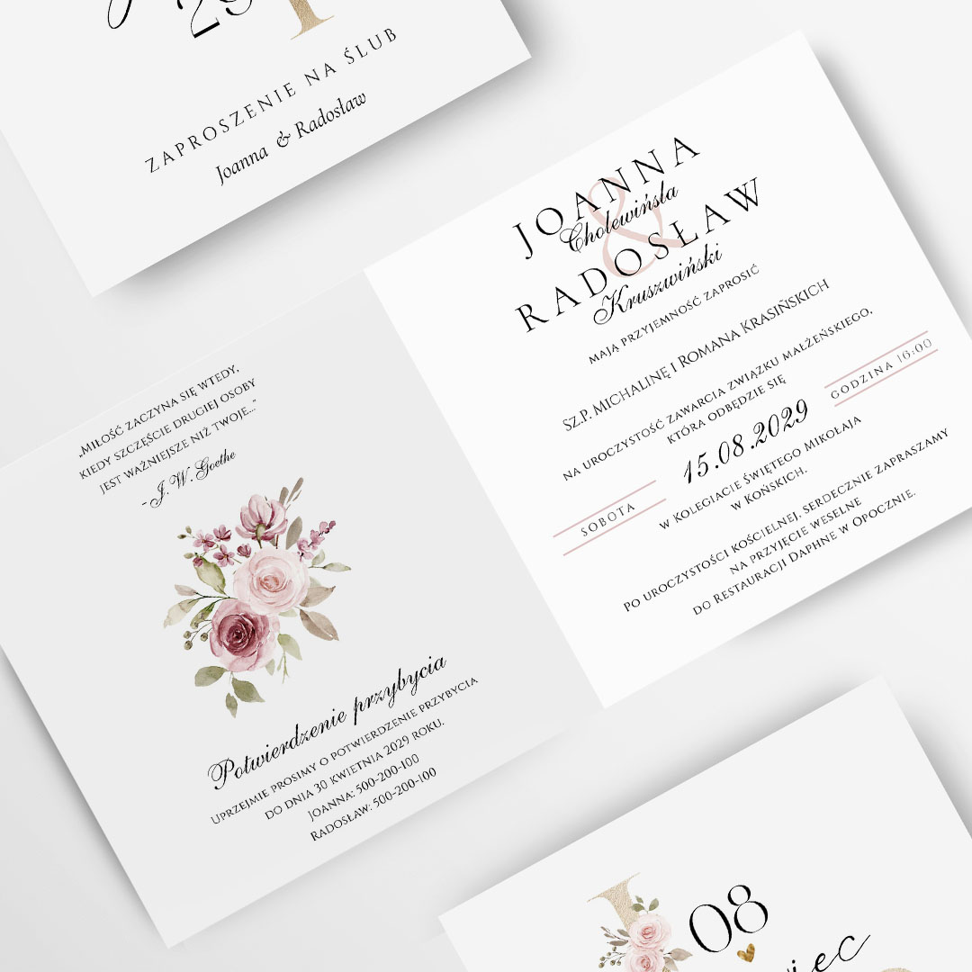 Zaproszenia drukowane są cyfrowo w kolorystyce CMYK i nie posiadają tłoczeń folią oraz dodatkowych uszlachetnień.