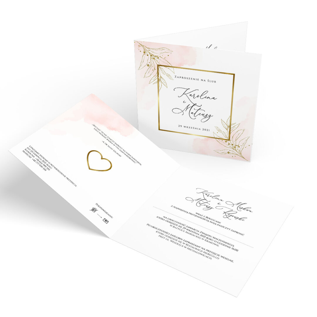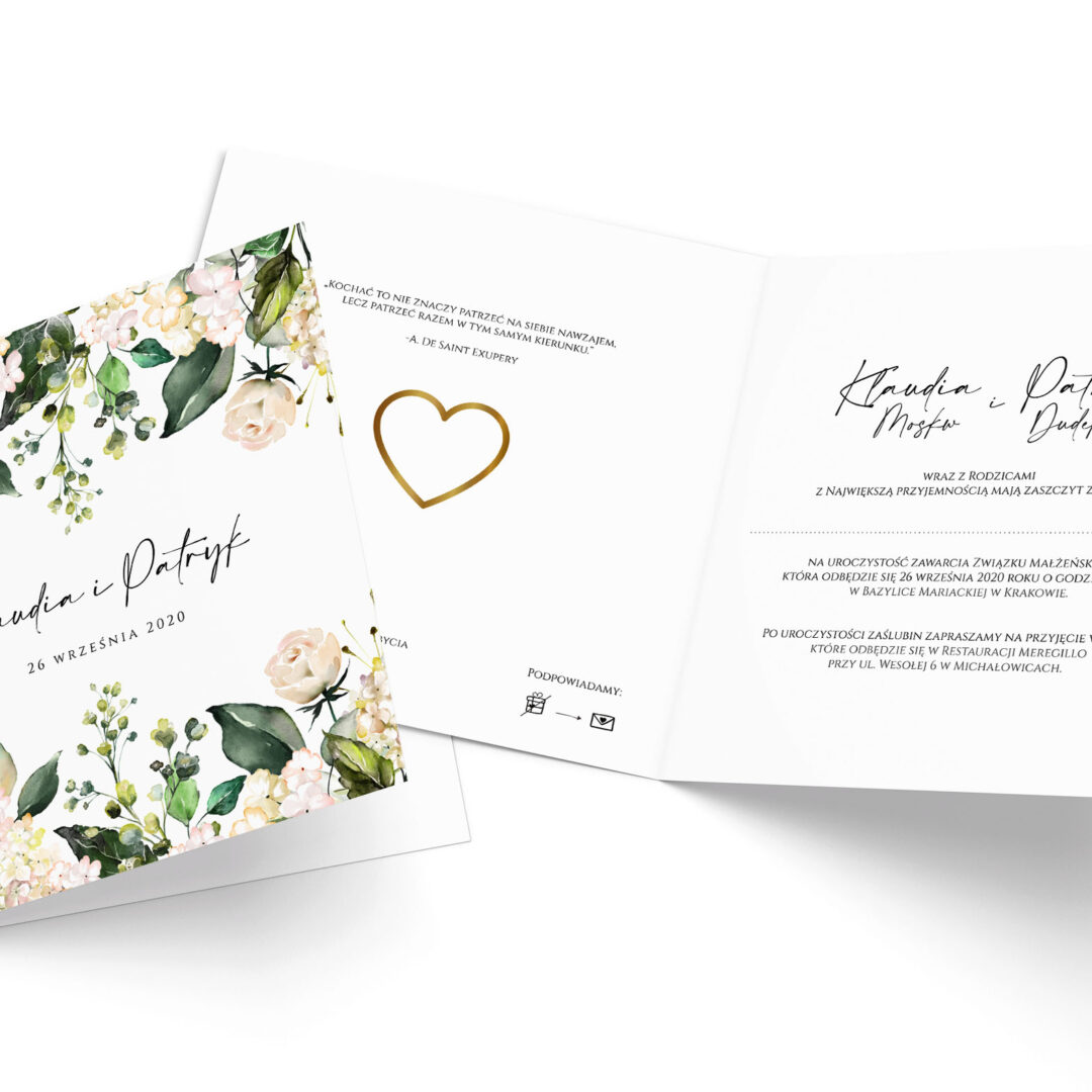 Zaproszenie jest wykonane z wysokiej jakości papieru, zdobione delikatnymi, pastelowymi kwiatami oraz złotymi akcentami, co nadaje mu wyjątkowego charakteru. Idealne dla par, które cenią sobie klasyczną elegancję i subtelną estetykę.