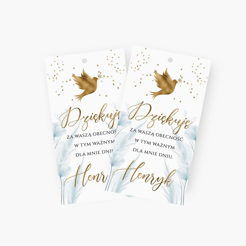 Zawieszki z podziękowaniem na uroczystości dziecięce to subtelny, a jednocześnie niezwykle uroczy sposób na okazanie wdzięczności bliskim za obecność w tym ważnym dniu. Idealne na komunię świętą – pięknie dopełniają aranżację stołu oraz dekorację upominków wręczanych gościom. Zawieszki drukowane są na wysokiej jakości papierze, z dbałością o każdy detal, a możliwość personalizacji (np. imienia dziecka, daty uroczystości lub krótkiego tekstu podziękowania) sprawia, że każda z nich nabiera indywidualnego charakteru. Doskonale sprawdzą się przy słoiczkach z miodem, pudełeczkach ze słodkościami czy drobnych prezencikach – tworząc spójną i stylową oprawę przyjęcia.