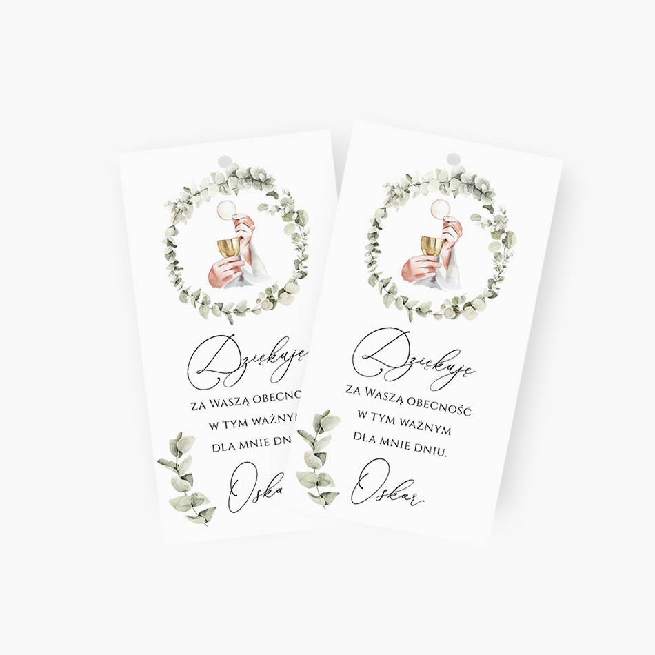 Zawieszki z podziękowaniem na uroczystości dziecięce to subtelny, a jednocześnie niezwykle uroczy sposób na okazanie wdzięczności bliskim za obecność w tym ważnym dniu. Idealne na komunię świętą – pięknie dopełniają aranżację stołu oraz dekorację upominków wręczanych gościom. Zawieszki drukowane są na wysokiej jakości papierze, z dbałością o każdy detal, a możliwość personalizacji (np. imienia dziecka, daty uroczystości lub krótkiego tekstu podziękowania) sprawia, że każda z nich nabiera indywidualnego charakteru. Doskonale sprawdzą się przy słoiczkach z miodem, pudełeczkach ze słodkościami czy drobnych prezencikach – tworząc spójną i stylową oprawę przyjęcia.